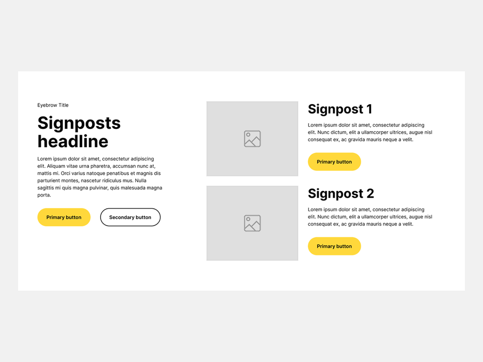 Each signpost acts as a simple navigation cue, pairing an image, headline and short description with a clear link. This makes it ideal for directing users to core services, priority content or key journeys while keeping the layout easy to scan and visually balanced.